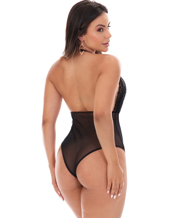 O decote em V na parte da frente valoriza o volume dos seus seios com ainda mais sensualidade. A renda acompanha toda a parte da frente, fazendo um jogo de mostra e esconde com nuances de pele e renda. Te deixando com um ar irresistível de mistério. O desenho da renda pode variar. As laterais assim como as costas deste body foram produzidas toda em tule para garantir muita transparência que não pode faltar em uma lingerie sexy. A alça é frente única, formando esse decote maravilhoso nas costas.