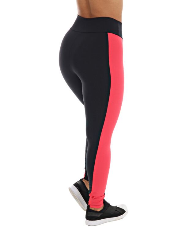 Possui o modelo de calça longa com cós médio, bem como um detalhe de faixa lateral na cor salmão. Tem o caimento perfeito na cintura, fornecendo maior sustentação e definição das curvas.