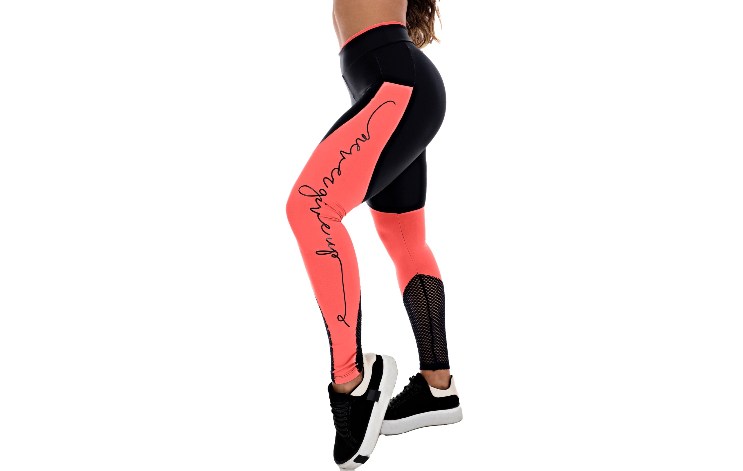 Possui o modelo de calça longa com cós médio, bem como detalhes de faixa salmão e tela vazada na canela. Da mesma forma, a peça conta com uma estampa lateral em silk com as inscrições “Never Give Up”, de significado “Nunca Desisto”. A peça está disponível na cor Preta, nos tamanhos do P ao G.