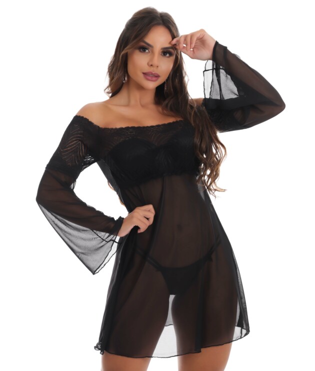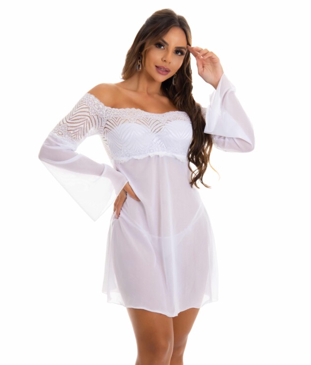 Aliás, sua composição não perde em nada: 85% Poliéster com 15% Elastano, tornando-a bem resistente e de toque leve a pele. Ela tem o modelo de camisola de tule com detalhe em renda jacatronica importada no busto, bem como possui estilo ciganinha e mangas longas boca de sino em tule. Tem um caimento despojado, dando um ar super charmoso ao look. Ela também acompanha de bojo inteiro embutido.