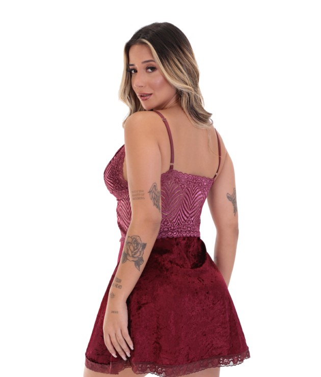 A Camisola em renda e veludo – Doris é definitivamente linda. Este modelo foi confeccionado especialmente para deixar as suas noites ainda mais perfeitas. Afinal, você merece todo o nosso melhor. E para garantir ainda mais a sua satisfação, este modelo possui uma composição maravilhosa. Esta camisola é composta por 90% poliéster e 10% elastano. Possui forro no busto. Não possui bojo. O desenho da renda pode variar, assim como a cor. Cor da peça definida pela cor do veludo. As alças possuem regulagem em plástico. E se você quer deixar o seu look noite ainda mais especial, não deixe de comprar o Robe de renda vazada – Bruna. Dê uma olhadinha também em nossa categoria de Calcinha. Principalmente na Calcinha confortável com laterais em renda – Lenita e na Calcinha com elástico bordado – Flor.