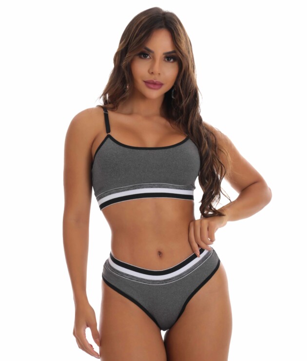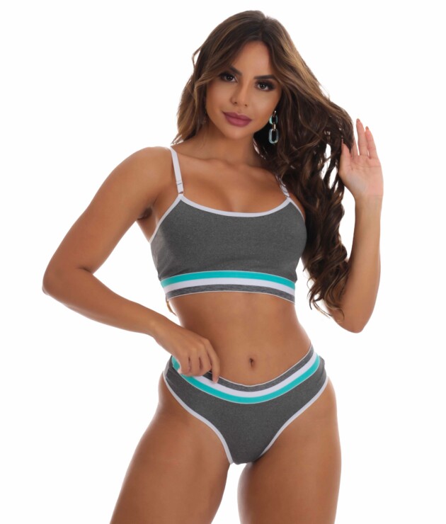 Seu Sutiã sem Bojo tem o estilo top com alças curtas com regulagem em metal, assim como uma pala elástica bicolor abaixo do busto — para maior sustentação e definição —. Sua calcinha fio tem a mesma composição e elástico na cintura, bem como um forro de 100% Algodão para sua maior segurança. A cor é definida pelo aviamento, que é feito de microfibra.