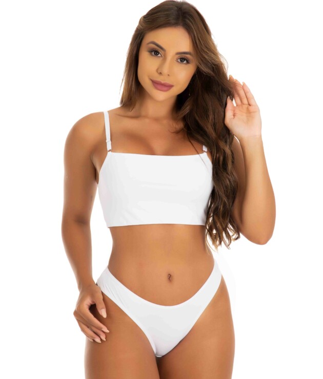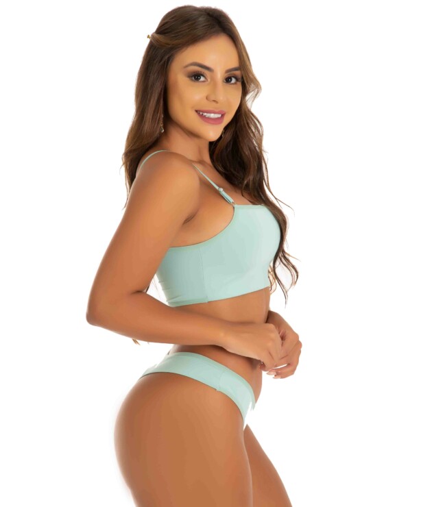 O Sutiã sem Bojo possui uma modelagem estilo top, além de alças finas com regulagem em metal. Já a Calcinha Conforto, tem o modelo fio duplo cavado que dá um destaque a cintura.