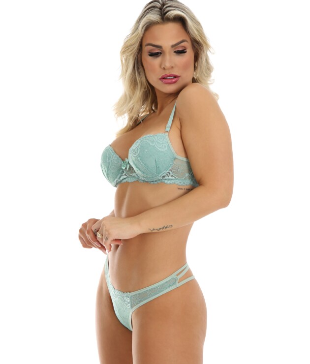O Sutiã possui todo um detalhamento em renda, bem como alças finas e regulagem em metal. Já a calcinha de renda tem o modelo cavado, assim como strappys em 3 tiras na parte traseira — dando aquele detalhe único à peça —. O estilo de renda na peça pode variar.