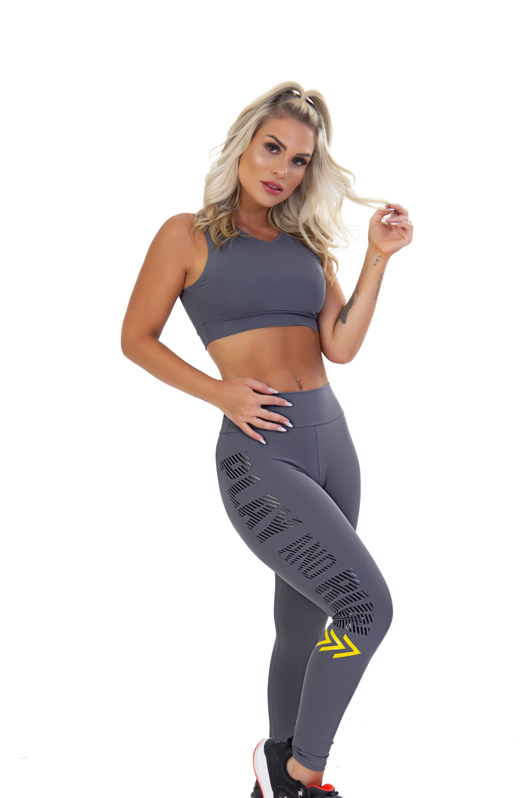 Esse Look Completo é perfeito, pois, além de ser super confortável e funcional, valorizará ainda mais sua beleza. A Calça Legging é estilo longa com cós alto em barra dupla, garantindo maior sustentação na cintura. Com a composição de 85% Poliamida com 15% Elastano, o tecido oferece maior compressão ao corpo sem perder no movimento. Além de proporcionar um toque macio e boa definição ao corpo. Ela também possui uma estampa emborrachada na lateral da perna, nas cores preto e amarelo. Está disponível na cor Cinza, nos tamanhos do P ao G.