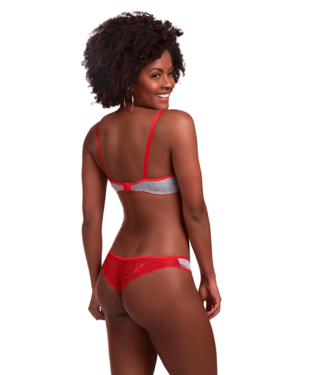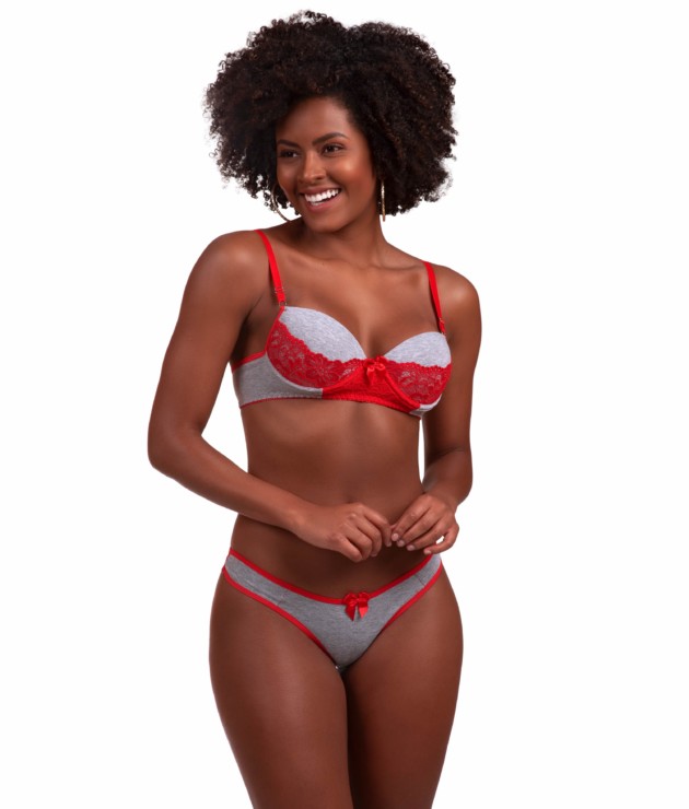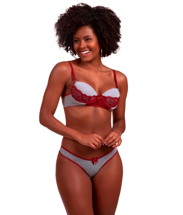O Conjunto com detalhe em renda – Joana vai te surpreender com ainda mais sensualidade e charme. Esse modelo de conjunto sempre tem o tecido em algodão na cor cinza mescla como pode ser visto na foto principal. A composição do tecido utilizado é de 80% algodão e 20% elastano. O forro de malha na calcinha é composto por 100% algodão. As alças sempre acompanham a cor da renda e tem regulagens em metal. Os bojos tem enchimento no estilo bolha nos tamanhos P e M. Nos tamanhos G e GG, o modelo tem bojo estilo casquinha. Compre também nossos Baby Dolls. Ainda mais o Baby Doll Lena.