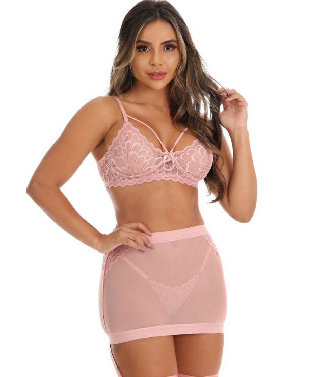 O Conjunto é formado por: um sutiã sem bojo com strappy e renda, assim como alças finas com regulagem de metal. Também conta com uma saia de tule com detalhe em renda, bem como perneiras fixas e um laço na parte traseira. Por fim, acompanha uma calcinha fio de renda. Tanto as perneiras quanto a calcinha, possuem regulagem em metal para facilitar e dar maior segurança ao ajuste. O desenho da renda pode variar.