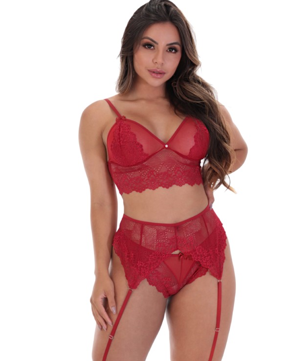 É claro que lingerie vermelha não pode faltar no seu guarda-roupa para te deixar ainda mais sexy. E foi pensando nisso que confeccionamos esta lingerie de renda sexy. Produzimos este modelo pensando em cada mínimo detalhe, com um design inovador e único pensado especialmente para valorizar as suas curvas. A cinta-liga valoriza a silhueta, criando um efeito visual mais curvilíneo que garante o famoso corpo violão. A perneira na coxa também é responsável por desenhar o formato da perna, te deixando ainda mais sensual.