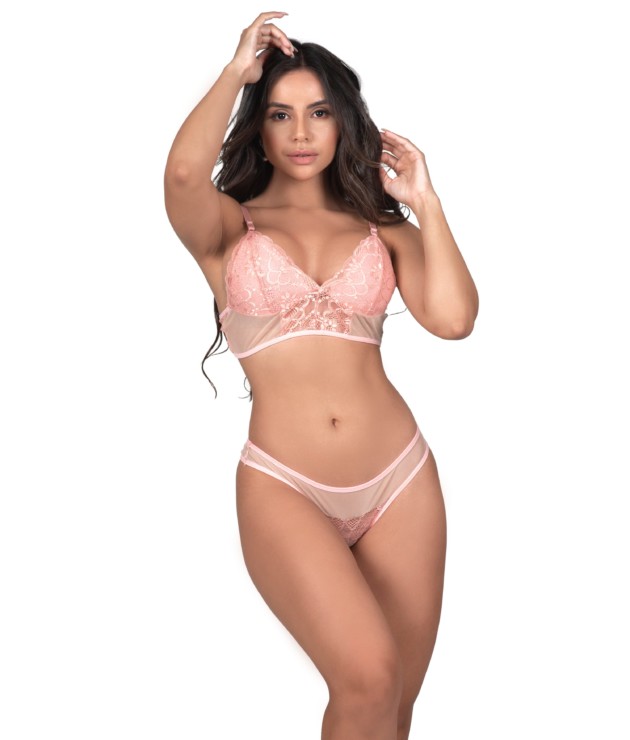 Lingerie sem bojo com renda e tule – Monica. Esse modelo de conjunto tem um lindo detalhe de transparência na calcinha e soutien. A cor do tule pode variar tendo composição de 82% poliamida e 18% elastano. O aviamento estilo microfibra no entanto sempre combina com a cor da renda. As alças ao mesmo tempo vem na cor do aviamento e tem regulagens em metal. Conheça hoje mesmo nossa pagina de roupas de dormir. Recentemente lançamos uma nova coleção de robes.