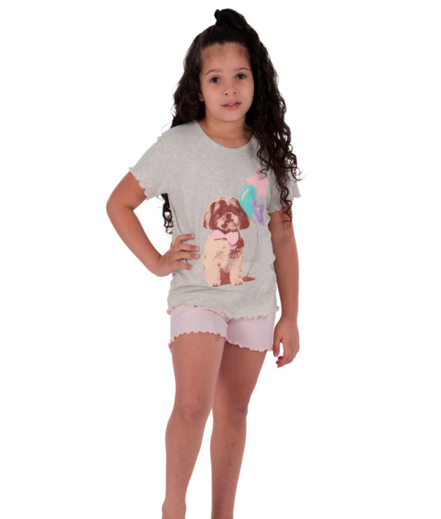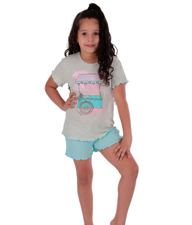 Ele é composto por 50% algodão e 50% poliéster. O tecido canelado possui um toque delicado e suave na pele, além de ser super charmoso. E para trazer ainda mais charme a este modelo, as extremidades possuem fru-fru. Este detalhe traz um toque super especial, que com certeza vai fazer a sua filha se apaixonar ainda mais por este pijama infantil, que também é uma ótima opção de presente. A estampa pode variar, com um desenho mais lindo e apaixonante do que o outro. A cor desta roupa de dormir é definida pelo short.