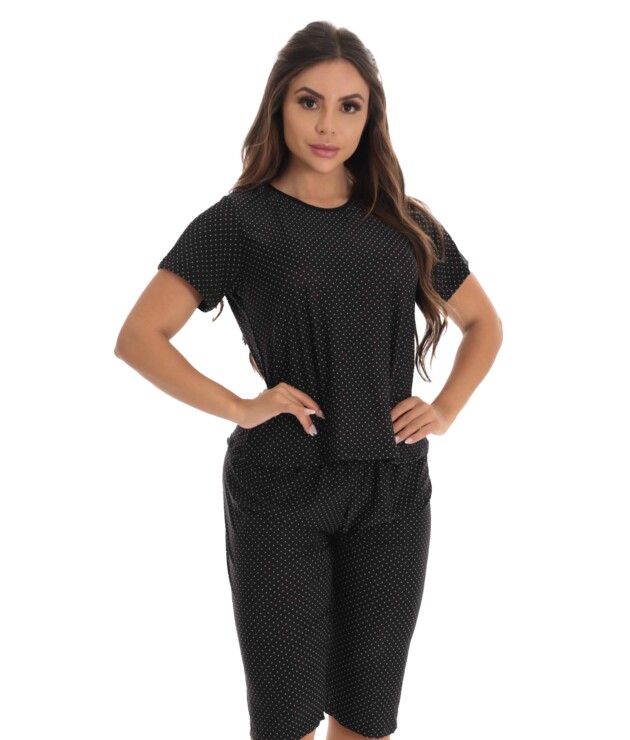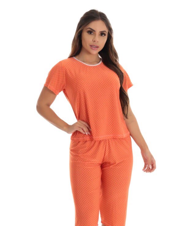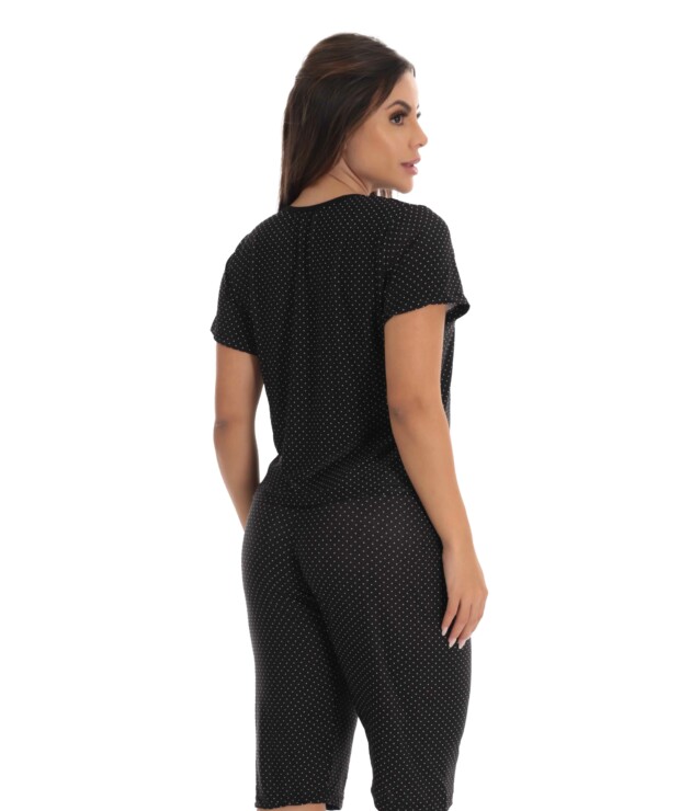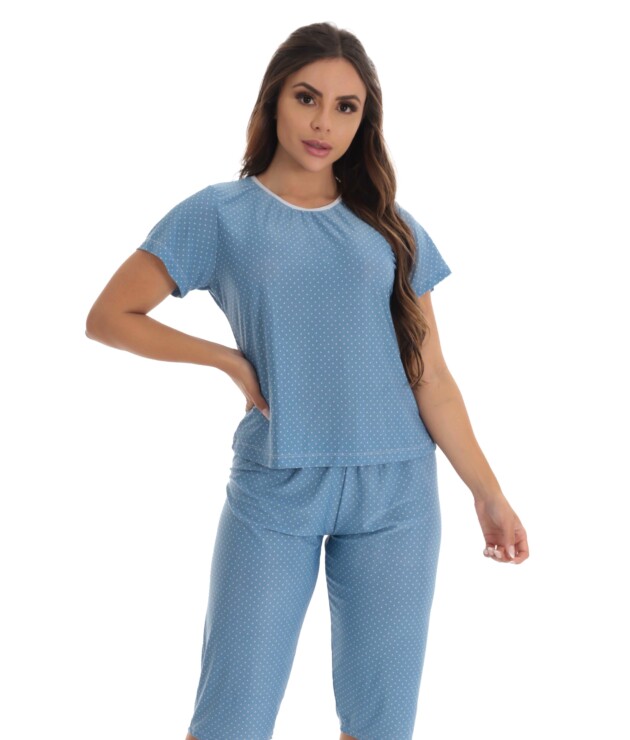 O Pijama possui duas peças: uma camisa de manga e uma calça em estilo pescador, a mesma possui um elástico franzido na cintura para maior sustentação. Definitivamente você vai se apaixonar por este pijama!