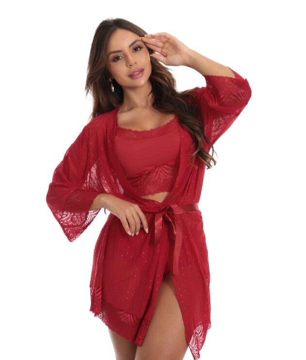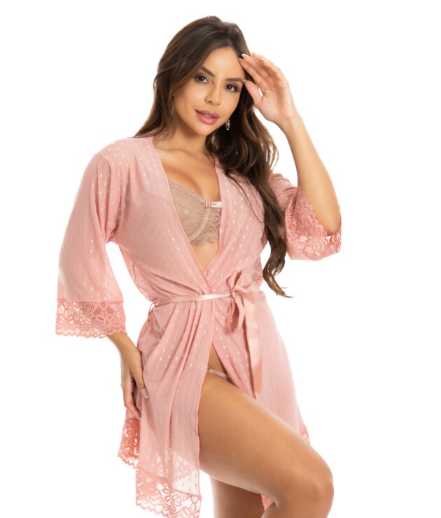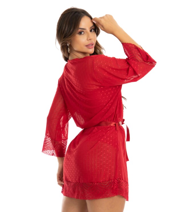 Esse Robe Feminino realmente é um mimo, perfeito para jogar com a transparência de um visual bem sedutor. Ele foi confeccionado no estilo curto com mangas 7/8, com detalhes de renda nas pontas e ainda acompanha de uma faixa de cetim para amarrar. Aliás, sua composição não perde em nada: um tecido suede com 90% Poliamida e 10% de Elastano; dando aquele aspecto macio de um toque super suave. É de se APAIXONAR!