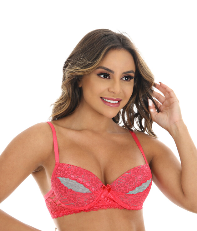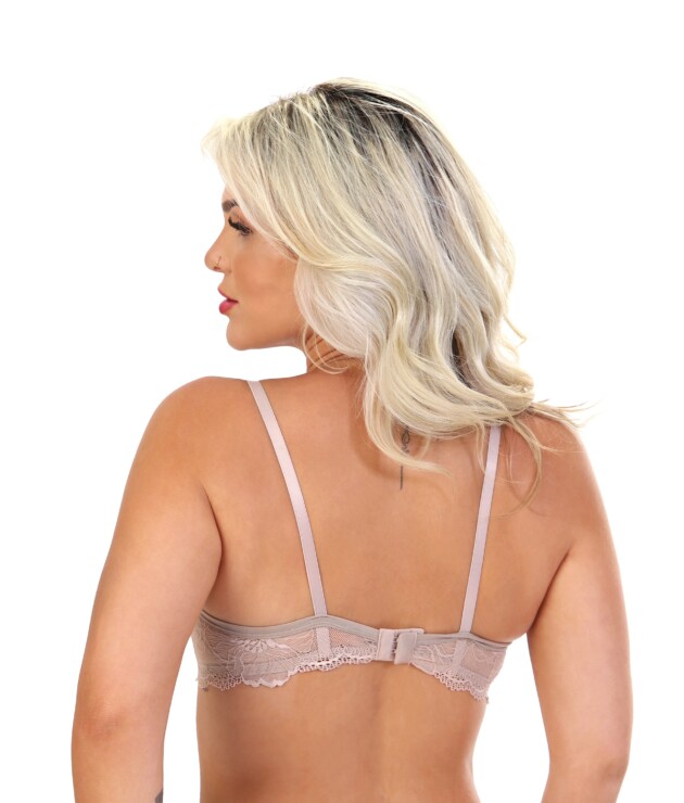 Está disponível nas cores Branco, Chocolate, Cinza e Tutti-Frutti. A Cor da peça definida pela renda, o fundo sempre é enviado em cinza mesclado. O desenho da renda pode variar. As alças possuem regulagem em metal. O arco de viés vai em plástico. E para garantir maior sustentação, este modelo possui elástico na pala.
