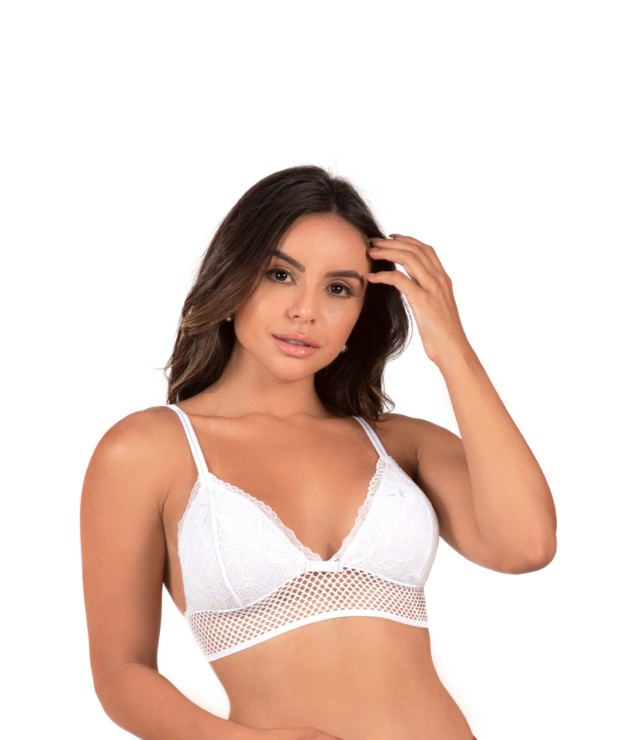 Se quer aquele sutiã delicado e moderno temos o modelo soutien sem bojo estilo cropped – Alessia. O busto é todo confeccionado em renda jacatrônica e possui forro para maior conforto durante o uso. Nas laterais é composta de transparência o que deixa a mulher sensual. As alças são compostas por duas tiras finas na parte frontal da peça. Na parte de trás as alças são normais com regulagem de metal. A pala é confeccionada com elástico todo trabalhando e delicado deixando a peça delicada e moderna. O colchete é triplo com duas regulagens apesar de ser confortável. Composição da peça: 90% Poliéster, 10% Elastano. Renda: 82% Poliamida, 18% Elastano. Disponível nas cores: Branco e Preto. Tamanhos: P, M e G. Não possui aro.