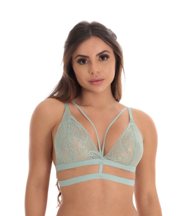 Sutiã em Tiras Gladiador de renda transparente super delicada, sem bojo e sem aros. Possui várias tiras em rolotê no busto e recorte geométrico, tendência da estação compondo looks com blusas abertas e transparentes. Conta também com alças com regulagem e tiras largas de elástico abaixo do seio com fecho de três colchetes dando maior firmeza no uso e efeito super natural ajustando-se a cada tipo de corpo.