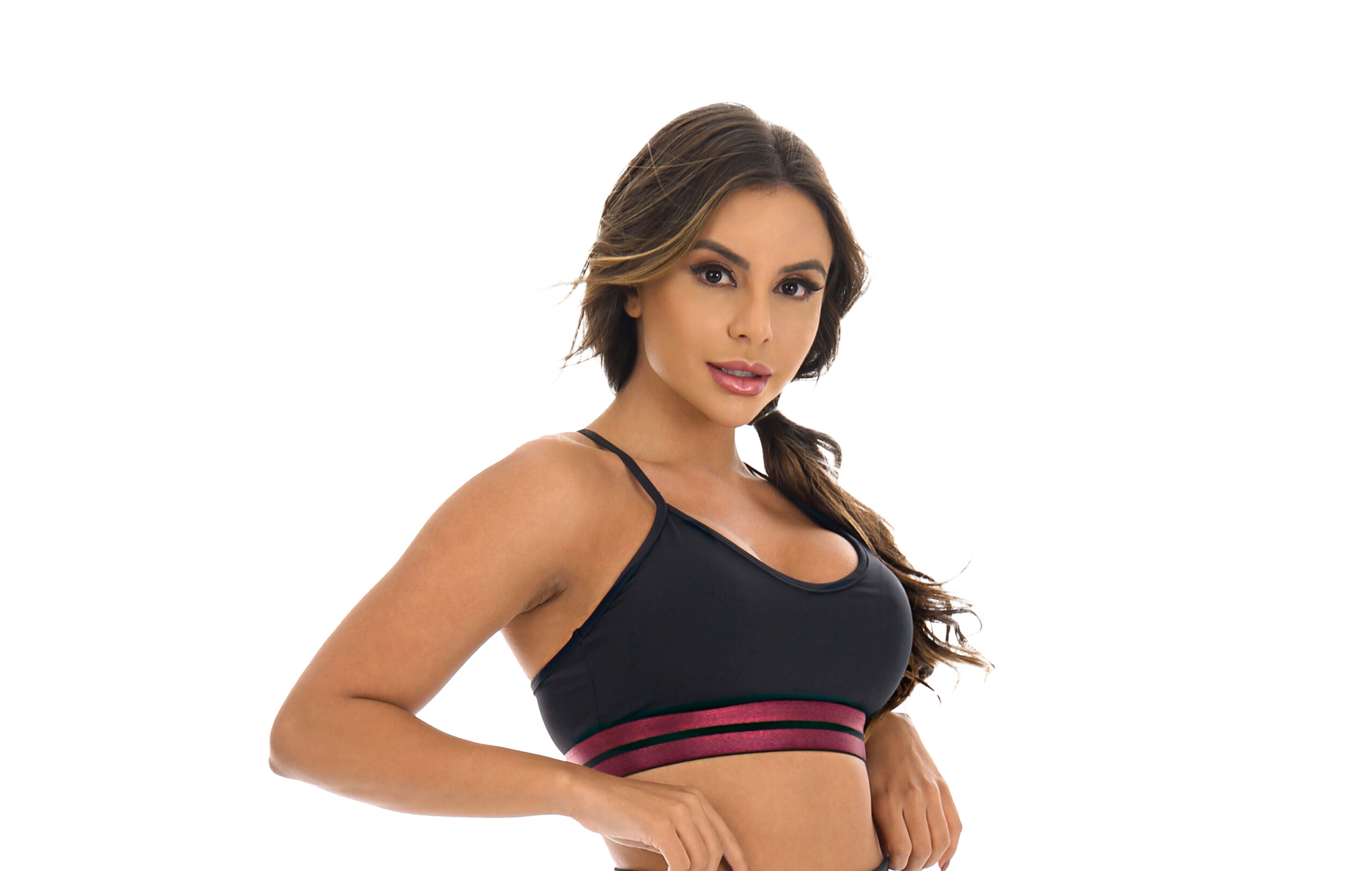 O Top Fitness está disponível na cor Preta, bem como nos tamanhos P/M e G. Possui bojo removível, além de um corte decotado reto e alças finas. Também conta com pala elástica listrada em vinho, abaixo do busto, que se define ao corpo e proporciona maior suporte.